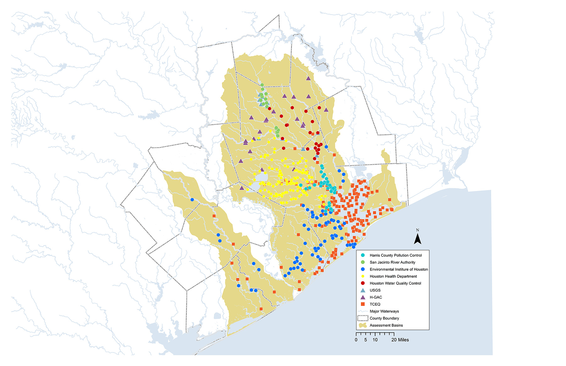 As part of the regional Quality Assurance Project Plan (QAPP), H-GAC works with local agencies to conduct water quality monitoring throughout the region. H-GAC’s CRP leverages program funding for these partnerships, allowing the program to increase monitoring stations and provide additional data that benefits the overall assessment process. CRP partners meet quarterly to discuss monitoring challenges, sampling protocols, equipment problems, and to serve as a forum for sharing information from the TCEQ regarding quality assurance or data management issues. Monitoring sites are funded wholly or in part by CRP. Coordinating monitoring efforts through CRP allows partner agencies to reduce costs by minimizing duplicated monitoring events. These savings can then be reinvested in expanded monitoring, special studies, and other tools to better assess regional water quality.